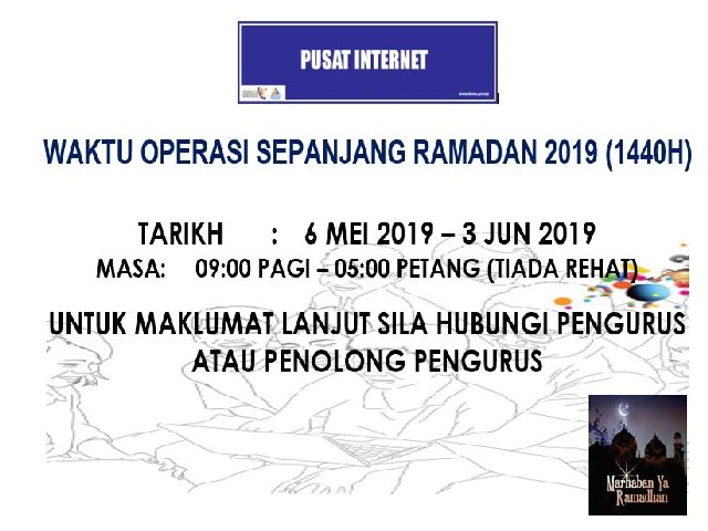 Berikut adalah Notis Waktu Operasi Pusat Internet Batang Melaka pada bulan Ramadhan bermula 6 Mei - 3 Jun 2019