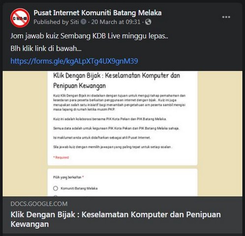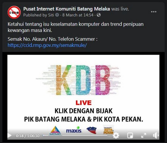 Pada 08 Mac 2021 bersamaan hari Isnin, PIK Batang Melaka telah bekerjasama dengan PIK Kota Pekan membuat 1 sesi Live di facebook Page PIK masing-masing. Pada kali ini, Topik Keselamatan Komputer dan Penipuan Kewangan menjadi pilihan ini kerana melihat zaman kini terlalu banyak penggunaan komputer dan melayari internet. Setiap live akan disusuli dengan kuiz yang akan dimaklumakan melalui facebook page.