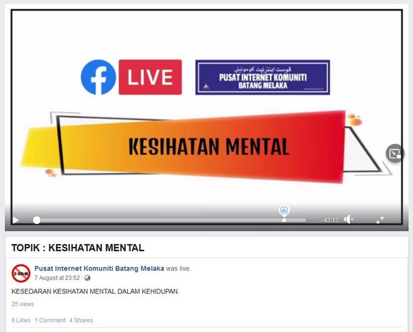 Pada 08 ogos 2021 bersamaan hari Ahad, PIK Batang Melaka telah membuat satu (1) sesi LIVE di Page Facebook PIK Batang Melaka untuk berkongsi tentang Kesedaran Kesihatan Mental.