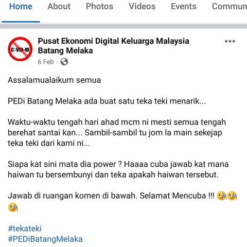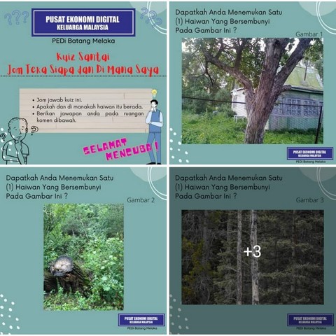 7 Februari 2022 | Aktiviti TerkiniPada 06 Februari 2022 bersamaan hari Ahad, PEDi Batang Melaka telah telah mengadakan satu kuiz teka teki secara atas talian di laman facebook rasmi iaitu “Teka-Teki - Cari haiwan tersembunyi” Penyertaan kuiz teka teki ini dibuka kepada semua ahli PEDi Batang Melaka dan juga komuniti setempat. Kuiz ini adalah berkaitan beberapa keping gambar yang perlu dikenal pasti apakah ia dan dimana haiwan tersebut bersembunyi
