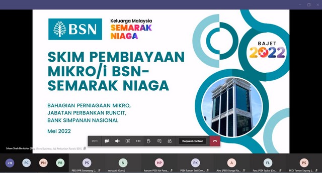 11 Jun 2022 | Aktiviti TerkiniPada 10 Jun 2022 bersamaan hari jumaat, pihak BSN telah menganjurkan satu “Staff Training” bagi menerangkan tentang Skim Pembiayaan Mikro/i BSN - Semarak Niaga. Ia bertujuan bagi memberi pendedahan dan bimbingan kepada staff PEDi bagaimana untuk membantu usahawan PEDi untuk memohon skim ini.