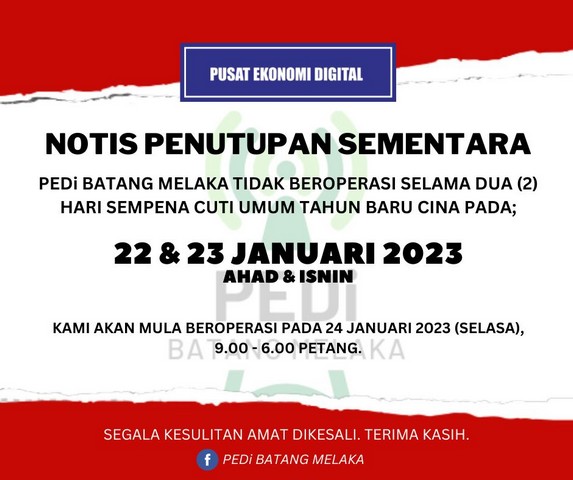 24 Januari 2023 | Aktiviti TerkiniPEDi tidak beroperasi selama 2 hari pada 22 & 23 Januari 2022 / Ahad & Isnin. Kami akan beroperasi semula pada 24 Januari 2023 9.00pagi – 6.00 petang