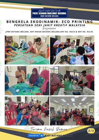 25 Mac 2024 | Aktiviti TerkiniPada 24 Mac 2024 bersamaan hari Ahad, NADI Batang Melaka telah membuat Ecodinamik: Bengkel Eco Printing anjuran Persatuan Seni Jahitan Kreatif Malaysia dengan kerjasama JPKK Batang Melaka, KRT Pekan Batang Melaka, KRT Kg. Hulu dan KRT Kg. Hilir.