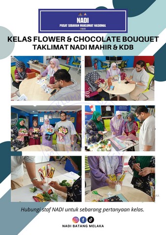 20 Oktober 2024 | Aktiviti TerkiniPada 19 Oktober 2024 bersamaan hari Sabtu, NADI Batang Melaka telah mengadakan Kelas Penghasilan: Flower & Chocolate Bouquet dengan bimbingan oleh Nur Shahira, seorang usahawan bouquet yang berpengalaman.