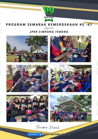 26 Ogos 2024 | Aktiviti TerkiniPada 25 Ogos 2024 bersamaan hari Ahad, JPKK Simpang Tebong telah menganjurkan Program Semarak Kemerdekaan Malaysia ke-67 dengan kerjasama JPKK (B) On Lok, KRT Kampung Hilir, Gerakan Belia 4B Malaysia Cawangan Batang Melaka Baru, NADI Batang Melaka dan Perpustakaan Desa Batang Melaka di Padang Permainan Taman Seri Hilir Batang Melaka.