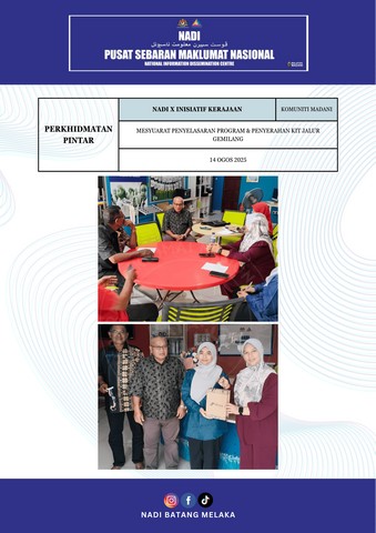 Pada 14 Ogos 2025 bersamaan hari Khamis, Mesyuarat Penyelasaran Program & Penyerahan Kit Jalur Gemilang telah diadakan. Mesyuarat ini melibatkan Petugas NADI Batang Melaka, Pegawai Jabatan Penerangan Daerah Jasin dan Ahli Komuniti Madani Selandar. Tujuan utama program ini adalah untuk menyelaras persiapan program akan datang dengan lebih teratur serta memupuk semangat patriotisme melalui penyerahan Kit Jalur Gemilang sebagai symbol penyatuan komuniti dalam menyambut Bulan Kebangsaan.