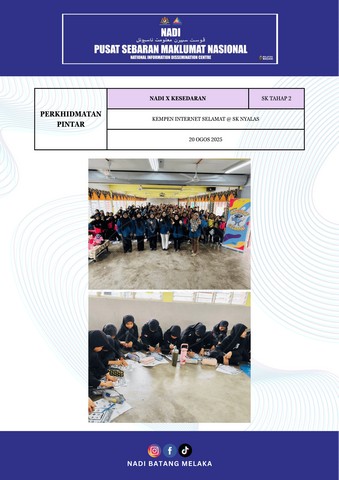 21 Ogos 2025 | Aktiviti TerkiniPada 20 Ogos 2025 bersamaan hari Rabu, Kempen Internet Selamat di SK Nyalas telah dilaksanakan oleh Petugas NADI dengan penglibatan daripada NADI Masjid Baru, NADI Batang Melaka, NADI Felda Tun Ghafar Air Kangkong, NADI Kampung Terentang, NADI Kesang Barat & NADI Air Panas. Tujuan utama program ini adalah untuk meningkatkan kefahaman murid mengenai asas penggunaan Internet, memahami had umur penggunaan media sosial, menyedarkan mereka tentang ancaman siber, serta membantu murid mengenal pasti pilihan aktiviti alternatif yang lebih sihat dan bermanfaat di luar media sosial.