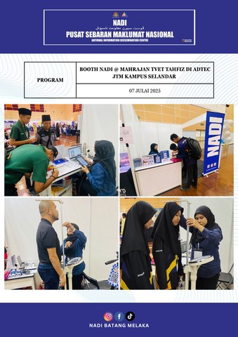 Pada 07 Julai 2025 bersamaan hari Isnin, Booth NADI @ Mahrajan TVET Tahfiz di ADTEC JTM Kampus Selandar di bawah bimbingan Petugas NADI telah dijalankan. Tujuan utama program ini adalah untuk memperkenalkan inisiatif NADI kepada masyarakat, mempromosikan pendaftaran keahlian percuma, menyediakan saringan kesihatan asas, serta memberi pengalaman interaktif melalui perkhidmatan digital yang ditawarkan.