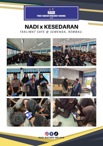 7 Januari 2025 | Aktiviti TerkiniPada 06/01/2025 bersamaan hari Isnin, Taklimat SAFE di SMK Datuk Abdullah oleh NADI Batang Melaka, NADI Kota Pekan & NADI Linggi telah dijalankan. Tujuan utama program ini adalah untuk memberikan kesedaran mengenai keselamatan berinternet dan membantu peserta mengenal pasti risiko serta cara-cara mengelakkan bahaya dalam penggunaan internet.