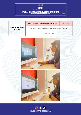 Pada 21 Oktober 2025 bersamaan hari Selasa, Webinar eKelas Usahawan Strategi Pemasaran Digital telah dijalankan. Tujuan utama program ini adalah untuk memberi pendedahan kepada para usahawan mengenai kepentingan pemasaran digital dalam era perniagaan masa kini, serta membantu mereka memahami strategi, teknik dan alat digital yang dapat meningkatkan kehadiran jenama dan meluaskan capaian pelanggan secara dalam talian.