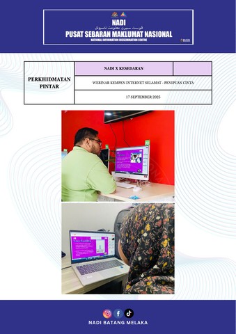 18 September 2025 | Aktiviti TerkiniPada 17 September 2025 bersamaan hari Rabu, Webinar Kempen Internet Selamat – Penipuan Cinta di bawah bimbingan Cik Atiqah telah diadakan. Tujuan utama program ini adalah untuk memberi kesedaran kepada Masyarakat tentang bahaya penipuan cinta di alam maya, memahami modus operandi yang digunakan oleh penipu serta membekalkan pengetahuan supaya orang ramai dapat melindungi diri daripada menjadi mangsa.