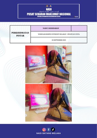 Pada 20 September 2025 bersamaan hari Sabtu, Webinar Kempen Internet Selamat – Penipuan Cinta di bawah bimbingan Cik Atiqah telah diadakan. Tujuan utama program ini adalah untuk memberi kesedaran kepada Masyarakat tentang bahaya penipuan cinta di alam maya, memahami modus operandi yang digunakan oleh penipu serta membekalkan pengetahuan supaya orang ramai dapat melindungi diri daripada menjadi mangsa.