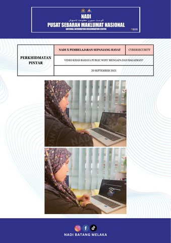 Pada 20 September 2025 bersamaan hari Sabtu, Video Khas Bahaya Public WIFI! telah diadakan melalui platform LMS Cybersecurity. Tujuan utama program ini adalah untuk memberi kesedaran kepada masyarakat tentang risiko sebenar menggunakan rangkaian WiFi awam atau percuma, di mana meskipun ia kelihatan mudah dan memudahkan urusan harian, ia sebenarnya boleh membuka ruang kepada pelbagai ancaman keselamatan seperti kecurian data, pencerobohan maklumat peribadi serta serangan siber tanpa disedari. Program ini juga menekankan pentingnya membuat pertimbangan yang bijak sebelum menyambungkan peranti kepada WiFi awam, serta menggalakkan amalan penggunaan Internet yang lebih selamat dan bertanggungjawab.