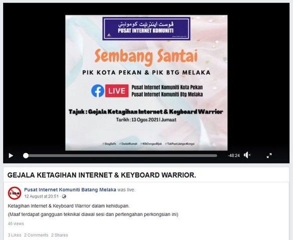 14 Ogos 2021 | Aktiviti TerkiniPada 13 Ogos 2021 bersamaan hari Jumaat, PIK Batang Melaka telah bekerjasama dengan PIK Kota Pekan mengadakan sesi LIVE Sembang Santai di Page Facebook PIK masing-masing.
