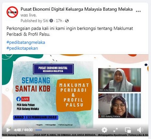 14 Februari 2022 | Aktiviti TerkiniPada 13 Februari 2022 bersamaan hari Ahad, PEDi Batang Melaka telah bekerjasama dengan PEDi Kota Pekan untuk mengadakan sesi LIVE Sembang Santai bertajuk “Maklumat Palsu & Profil Palsu” di Page Facebook PEDi masing-masing.