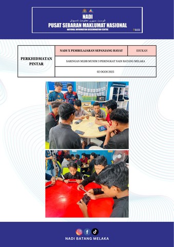 3 Ogos 2025 | Aktiviti TerkiniPada 02 Ogos 2025 bersamaan hari Sabtu, Saringan MLBB Musim 3 Peringkat NADI Batang Melaka di bawah bimbingan Petugas NADI telah diadakan. Tujuan utama program ini adalah untuk mencungkil bakat e-sukan dalam kalangan belia setempat serta memberi ruang kepada mereka untuk mewakili NADI ke peringkat negeri Melaka.