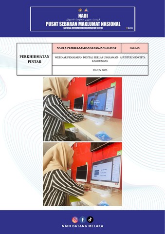 4 Jun 2025 | Aktiviti TerkiniPada 03/06/2025 bersamaan hari Selasa, Webinar Pemasaran Digital eKelas Usahawan - AI untuk Mencipta Kandungan di bawah bimbingan Encik Danial Maridz telah dijalankan. Tujuan utama program ini adalah untuk membimbing para usahawan dalam memahami dan mengaplikasikan kecerdasan buatan (AI) sebagai alat bantu bagi mencipta kandungan pemasaran digital yang lebih efektif, menjimatkan masa, dan meningkatkan daya tarikan di media sosial.
