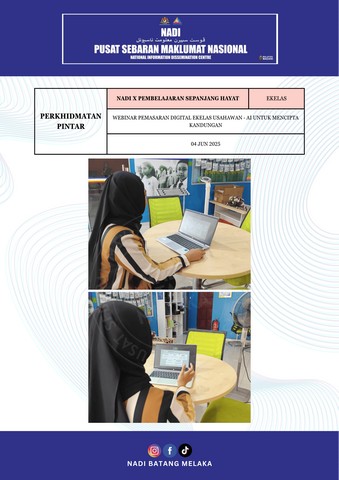 5 Jun 2025 | Aktiviti TerkiniPada 04/06/2025 bersamaan hari Rabu, Webinar Pemasaran Digital eKelas Usahawan - AI untuk Mencipta Kandungan di bawah bimbingan Encik Danial Maridz telah dijalankan. Tujuan utama program ini adalah untuk membimbing para usahawan dalam memahami dan mengaplikasikan kecerdasan buatan (AI) sebagai alat bantu bagi mencipta kandungan pemasaran digital yang lebih efektif, menjimatkan masa, dan meningkatkan daya tarikan di media sosial.