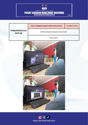 6 Mac 2026 | Aktiviti TerkiniPada 05 Mac 2026 bersamaan hari Khamis, Webinar Bahaya Serangan Malware telah diadakan. Tujuan utama program ini adalah untuk memberi kesedaran kepada peserta mengenai risiko serangan malware, kesan yang boleh ditimbulkan kepada peranti dan data serta langkah-langkah penting yang perlu diambil untuk melindungi diri daripada ancaman siber.