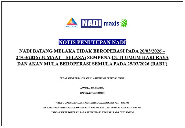 Notis Waktu Penutupan PEDi Batang Melaka sempena Hari Pekerja dan Hari Raya Aidilfitri
